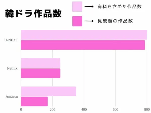 以下▼の「韓ドラ作品数」とは月額料金の範囲内で見られる韓国ドラマ作品数のことで、見放題作品と呼ばれるドラマの数です。