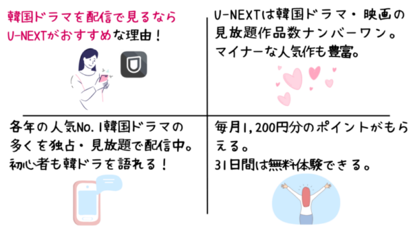 サービスごとのおすすめ作品や料金プランがいろいろで迷うかもしれませんが、韓国ドラマを日本語字幕付きで見る場合「U-NEXTなら間違いない」と覚えていればOKですよ。